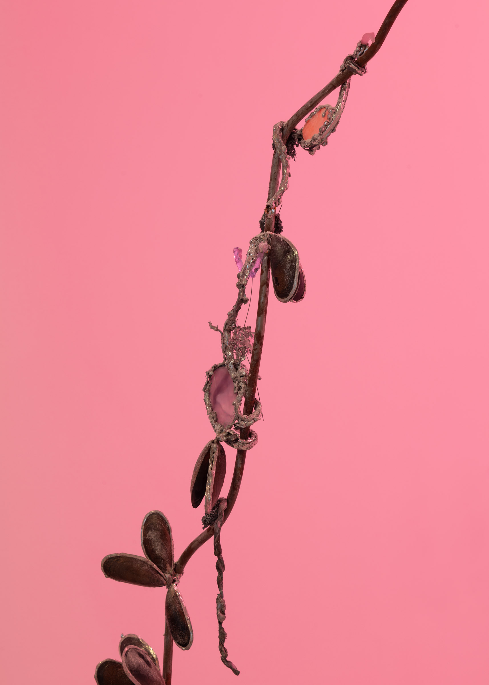 Contrasting the cold materiality of steel, an atmospheric pink light evokes the warmth of a perpetual sunset with the potential of a sunrise, or a dawn beckoning an unknown time. Recalling the triviality of human time to earthly—and more than earthly—time, her reconfigurations of creaturely life perform a slippery, anachronistic dance like an eyelid flickering over a pupila (pupil).
